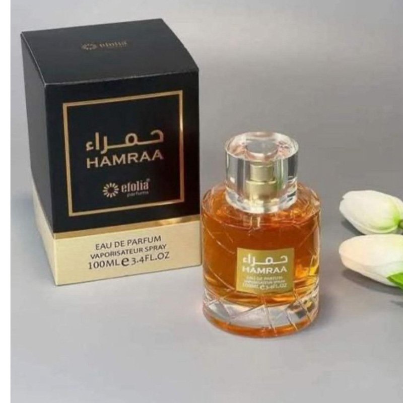 HAMARA (100ml, Eau de Parfum) is a premium Arabic perfume known for its warm, sweet, and sensual scent. It opens with sweet spices, blends into a rich vanilla–amber heart, and settles into a smooth oud base that leaves a luxurious trail.